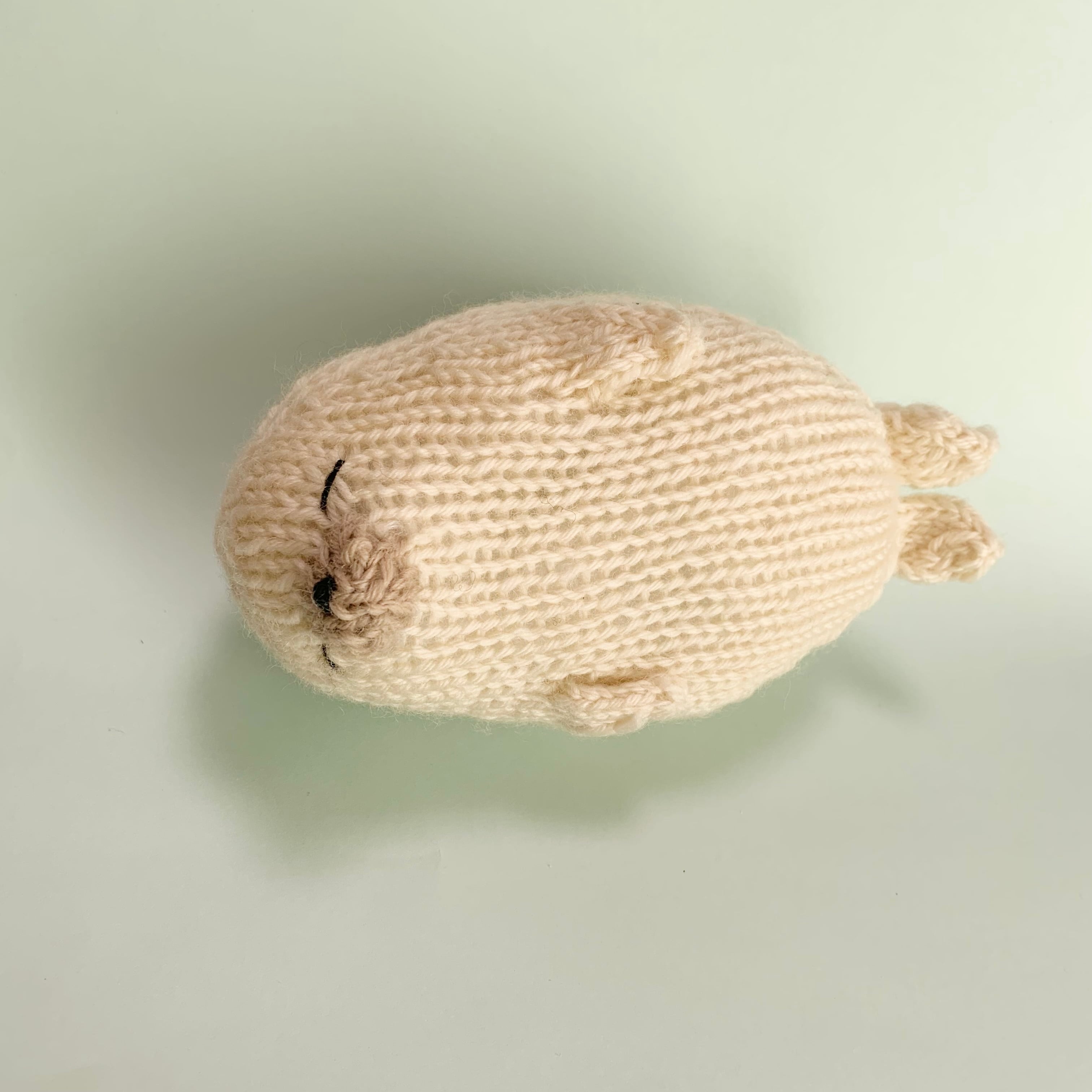 編み方…輪針をマジックループにして、頭から後ろ足まで輪で編んでいきます。その後前足や鼻先は編み地から拾い目をして編んでいきます。